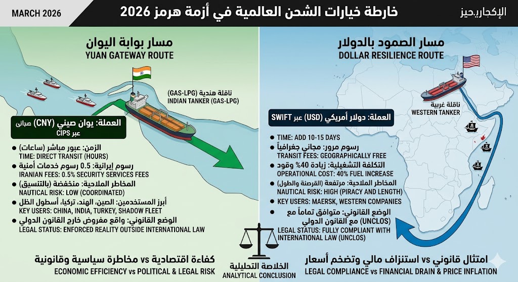 كما أن تكلفة المخاطرة تنخفض بشكل ملحوظ عند الدفع باليوان، إذ يضمن ذلك خفض أقساط تأمين الحرب نتيجة «المرور المنسق». وعند مقارنة هذا الخيار بمسار رأس الرجاء الصالح، يتبين أن الالتفاف حول أفريقيا يضيف نحو 15 يومًا إلى الرحلة، ويرفع استهلاك الوقود بنحو 40%، بما يقود إلى قفزة في التكاليف التشغيلية قد تصل إلى 200%. وهذا الواقع جعل من «يوان هرمز» خيارًا اضطراريًا للشركات الهندية والتركية والآسيوية الساعية إلى البقاء في المنافسة.